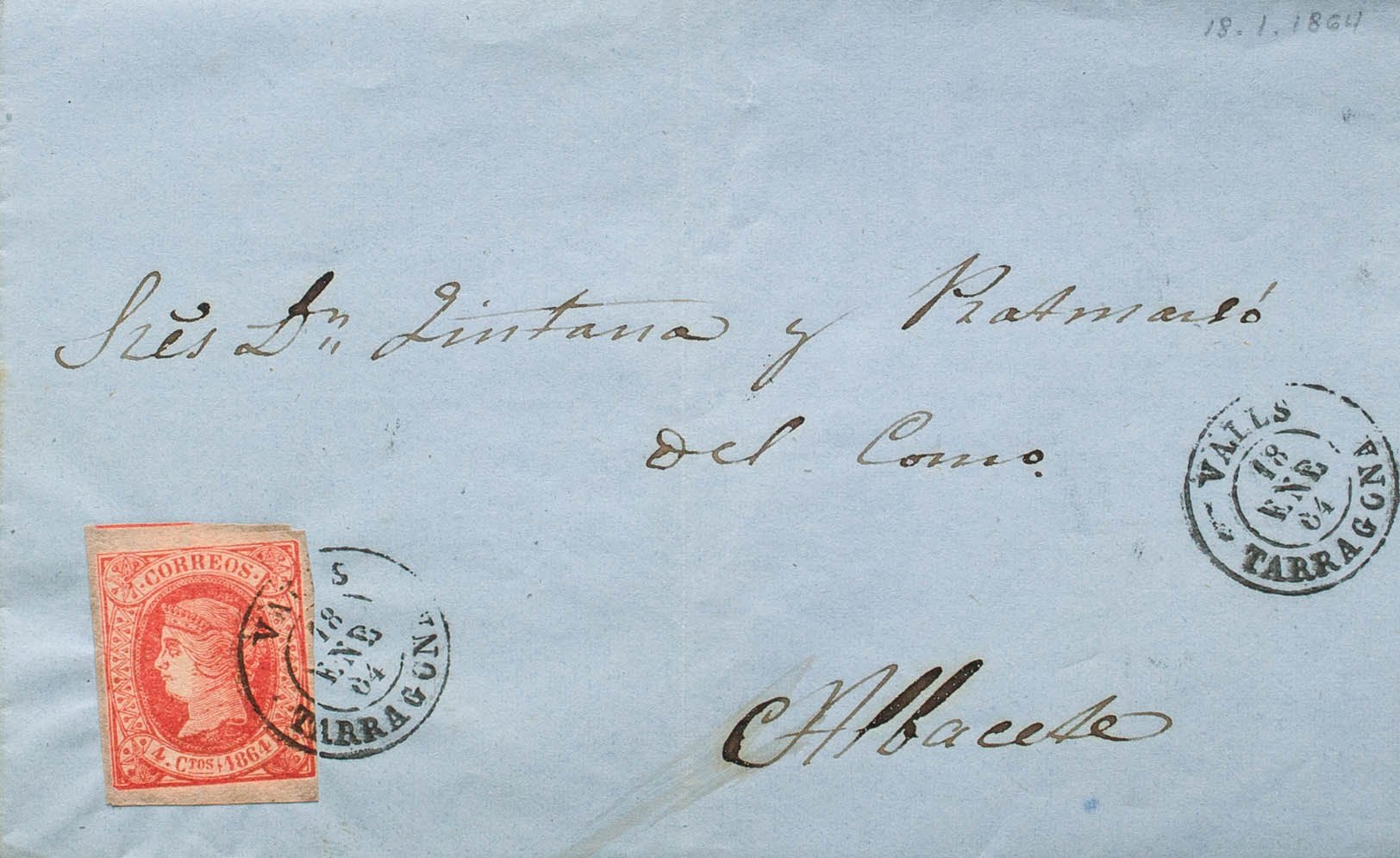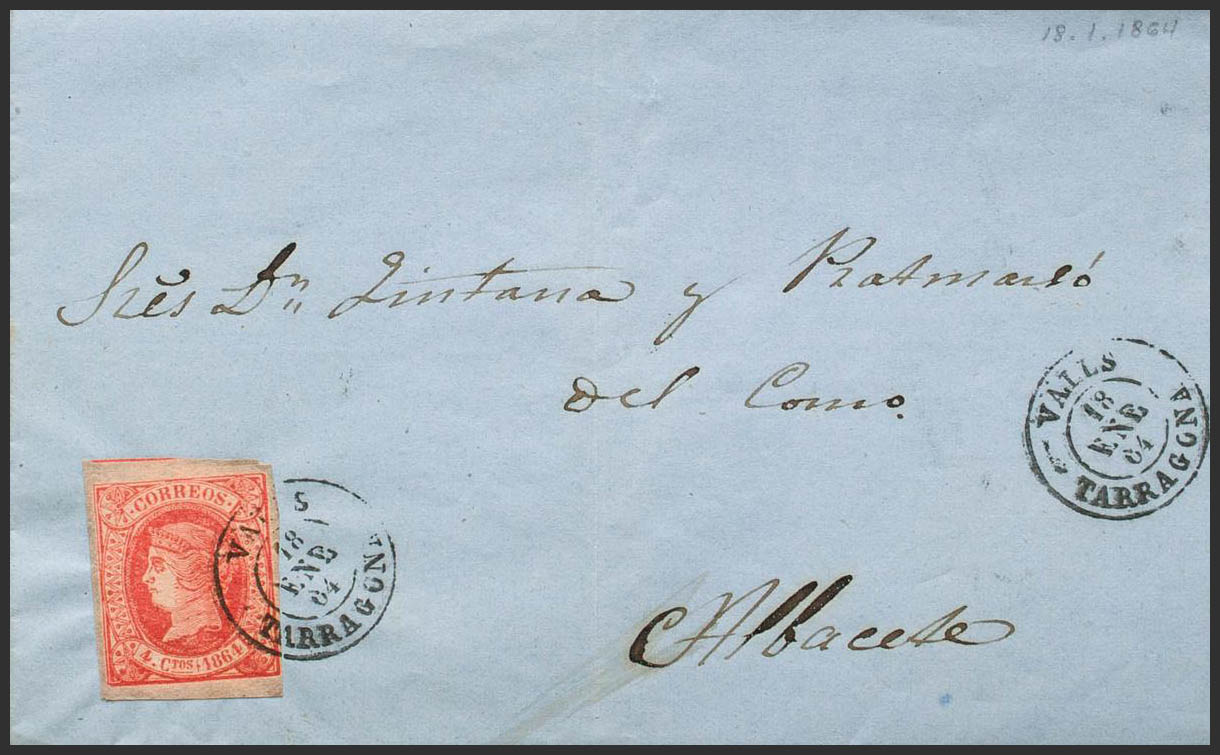 64. 1864. 4 red cuartos . VALLS to ALBACETE. Postmark VALLS / TARRAGONA. MAGNIFICENT. Ex-Blight.