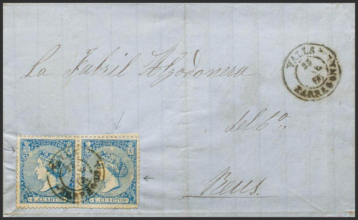 81(2). 1866. 4 cuartos blue, pair. VALLS to REUS. Postmark VALLS / TARRAGONA, double postage. MAGNIFICENT. Ex-Blight.
