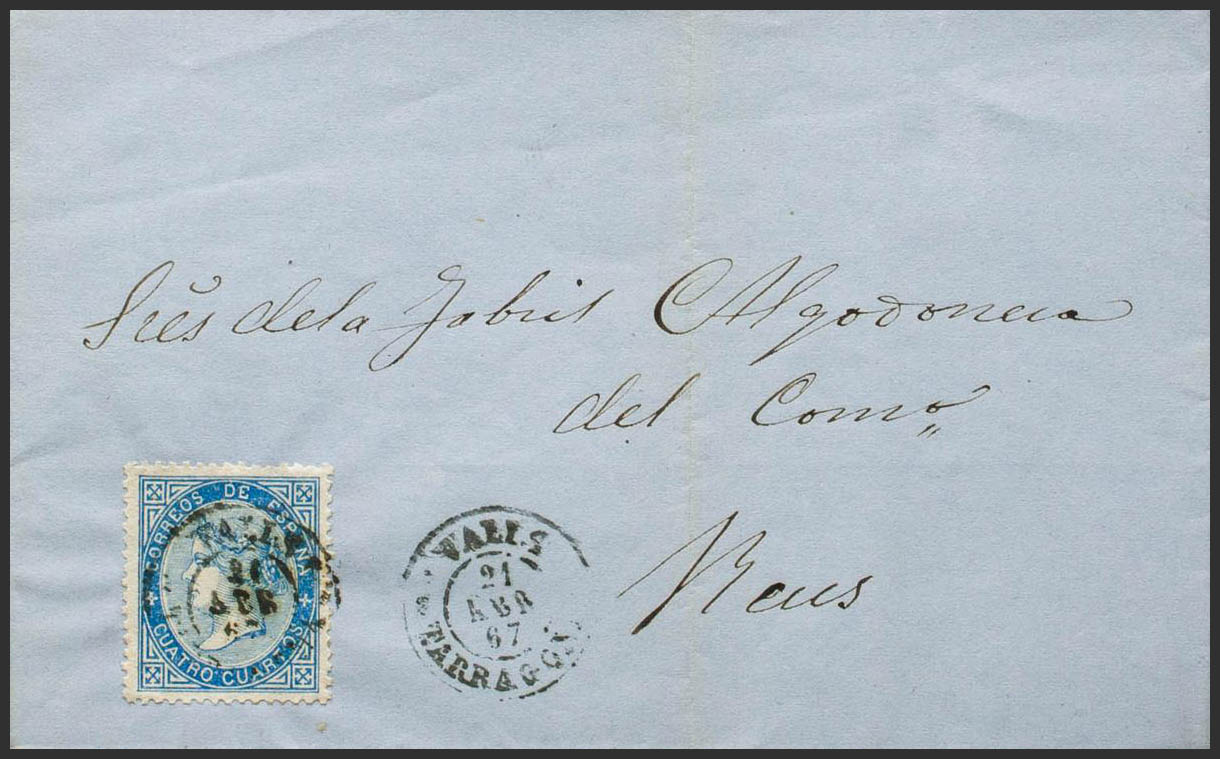 86. 1867. 4 cuartos blue. VALLS to REUS. Postmark VALLS / TARRAGONA. MAGNIFICENT. Ex-Blight.