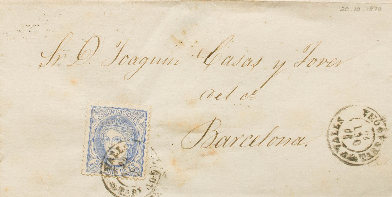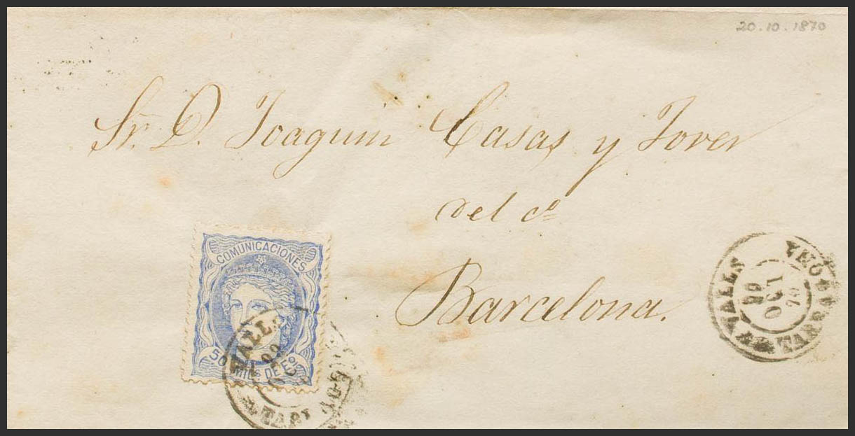 107. 1870. 50 mils overseas. VALLS to BARCELONA. Postmark VALLS / TARRAGONA. MAGNIFICENT. Ex-Blight.