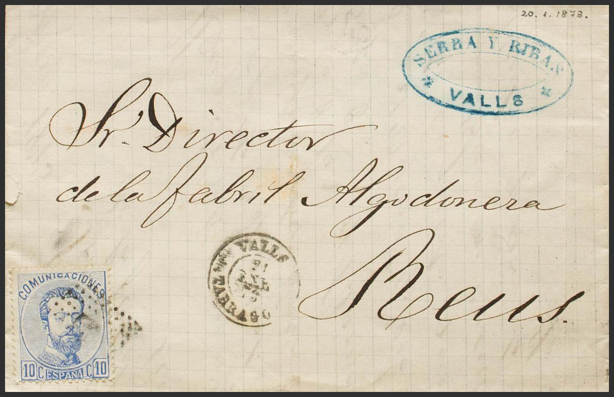 121. 1873. 10 overseas cts. VALLS to REUS. On the front dater VALLS / TARRAGONA. MAGNIFICENT. Ex-Blight.