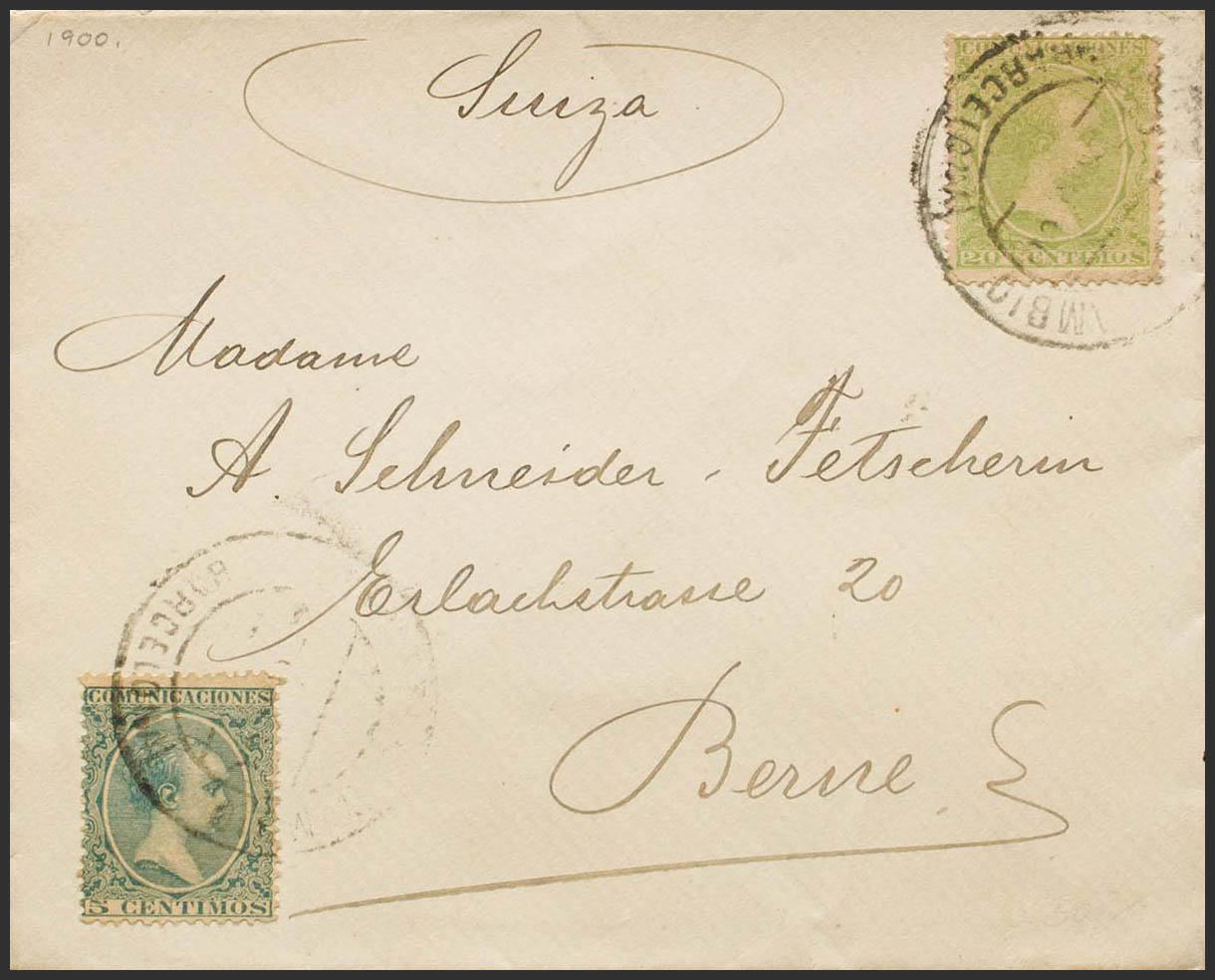 216, 220. 1900. 5 cts green and 20 cts green yellow. BARCELONA to BERN (SWITZERLAND). Postmark EXCHANGE POSTMARK / (BARCELONA). MAGNIFICENT. Ex-Blight.
