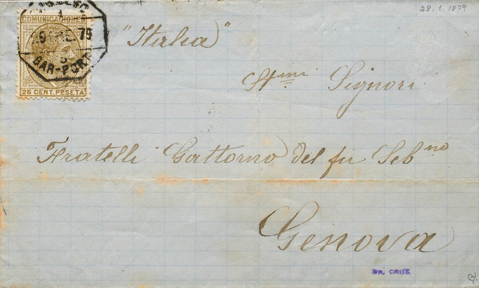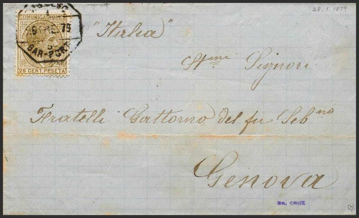 194. 1879. 25 cts sepia (toned). BARCELONA to GENOA (ITALY). Postmark AMB.DESC. / BAR.PORT. PRETTY. Ex-Blight.