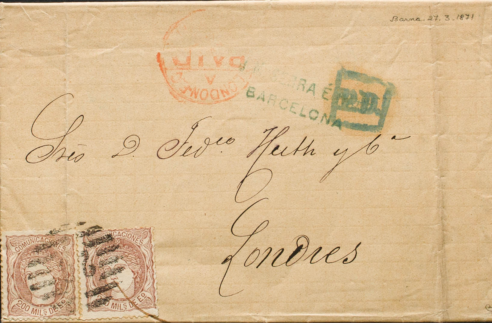 English 109(2). 1872. 200 chestnut mils, two stamps. BARCELONA to LONDON (GREAT BRITAIN). Double bearing. MAGNIFICENT. Ex-Blight.