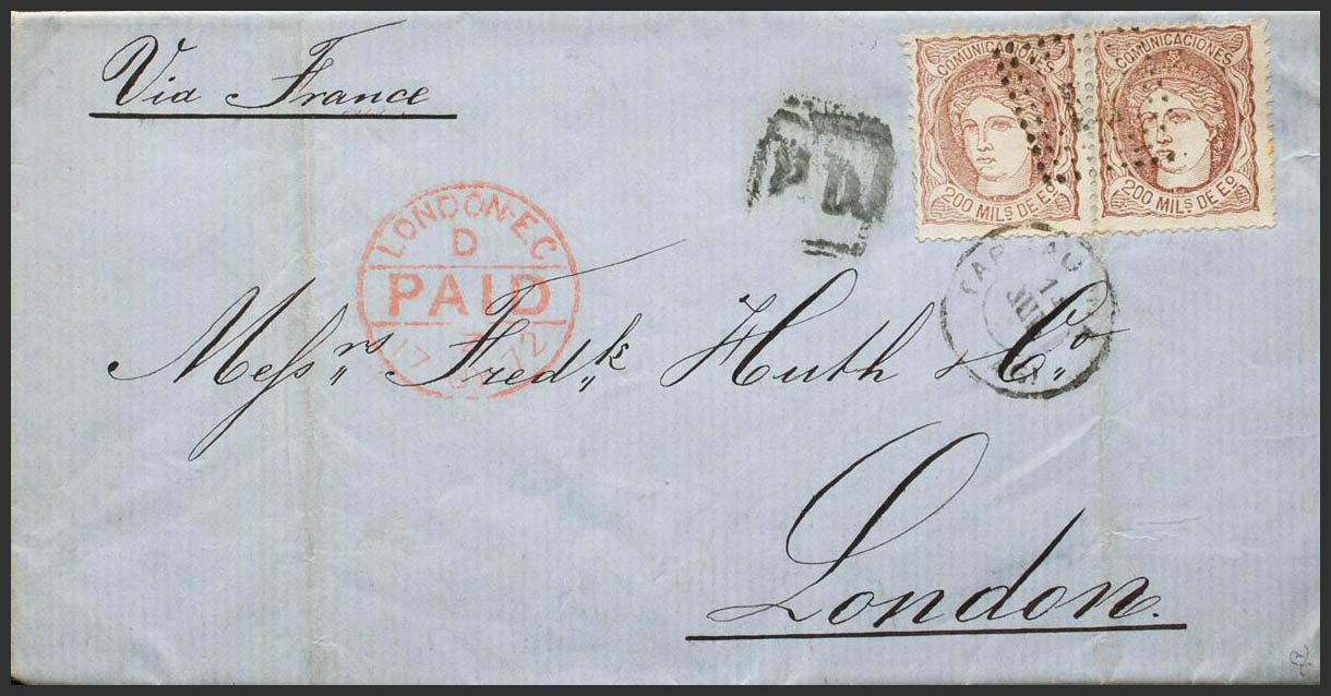 109(2). 1872. 200 chestnut mils, two stamps. BARCELONA to LONDON (GREAT BRITAIN). Double bearing. MAGNIFICENT. Ex-Blight.