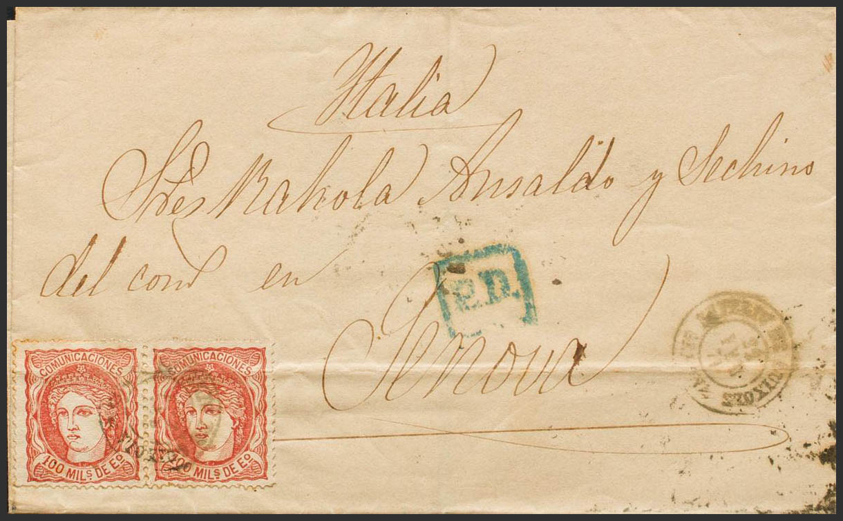 108(2). 1871. 100 mils red chestnut, pair (archival fold). SAN FELIU DE GUIXOLS to GENOA (ITALY). Postmark SN FELIU DE GUIXOLS / GERONA. PRETTY. Ex-Blight.
