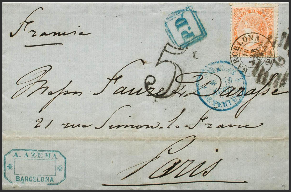 89A. 1868. 12 orange cuartos . BARCELONA to PARIS (FRANCE). Postmark GRILL WITH Nº2 and date stamp BARCELONA / (2). MAGNIFICENT. Ex-Blight.
