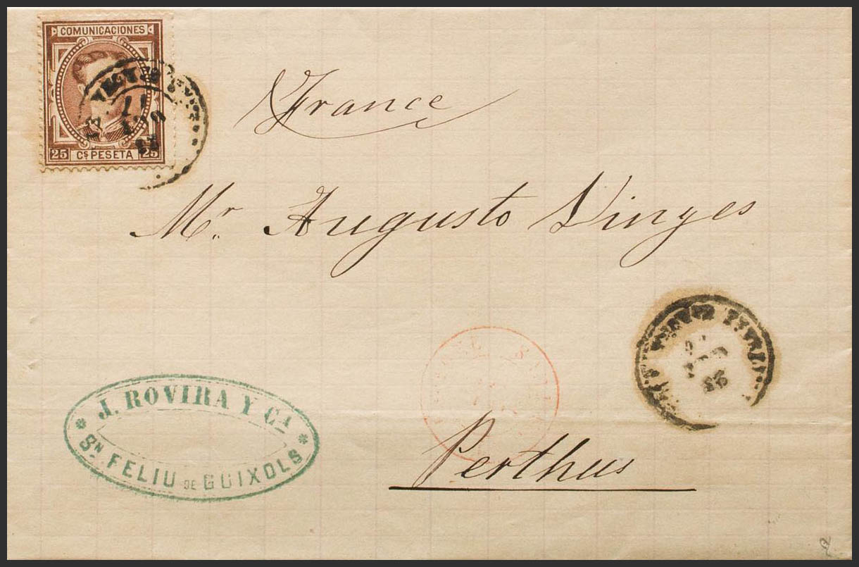 177. 1877. 25 cts red chestnut. SAN FELIU DE GUIXOLS to LE PERTHUS (FRANCE). Postmark SN. FELIU DE GUIXOLS / GERONA. MAGNIFICENT. Ex-Blight.