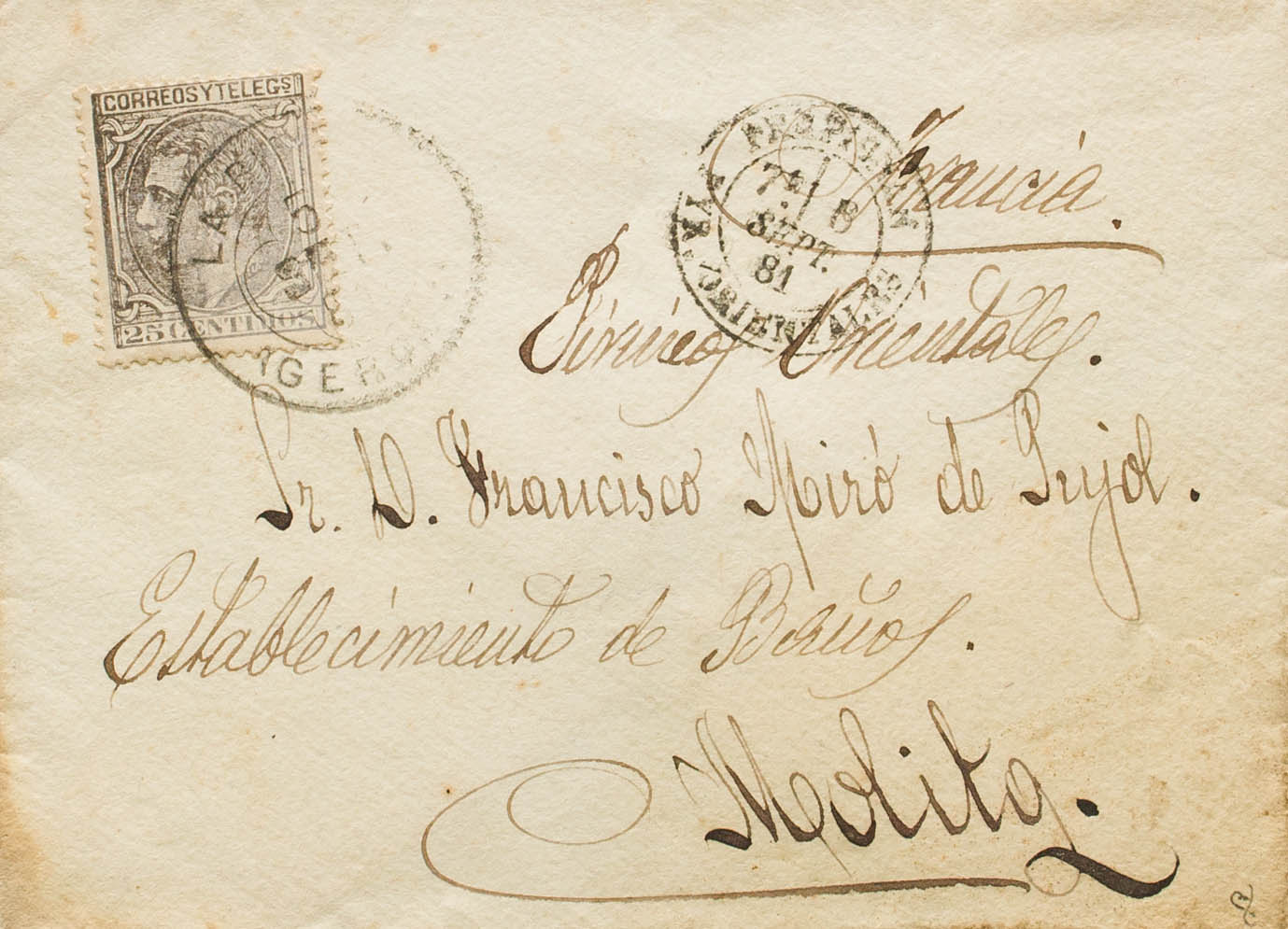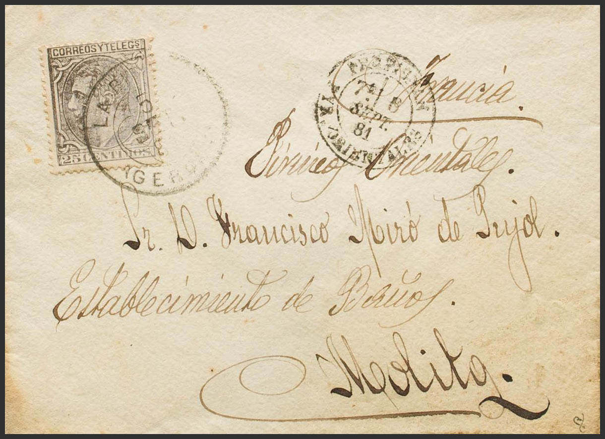 204. 1881. 25 gray cts. LA BISBAL to MOLITG (FRANCE). Postmark LA BISBAL / (GERONA). MAGNIFICENT. Ex-Blight.