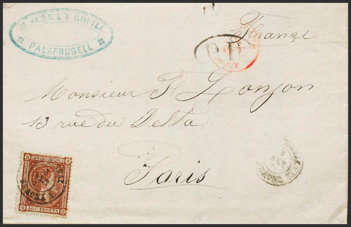 167. 1875. 40 chestnut cts. PALAFRUGELL to PARIS (FRANCE). Postmark LA BISBAL / GERONA. MAGNIFICENT. Ex-Blight.