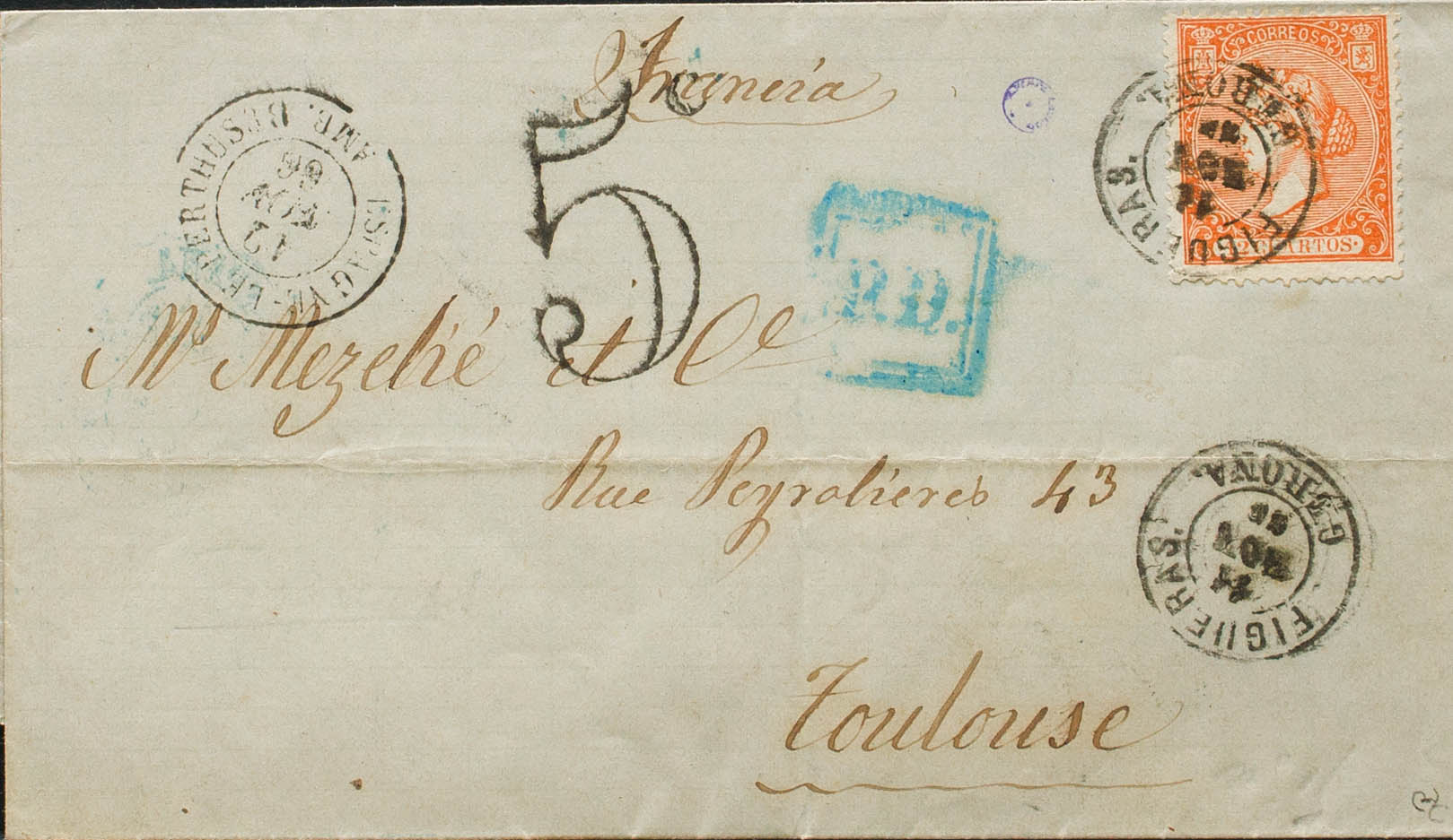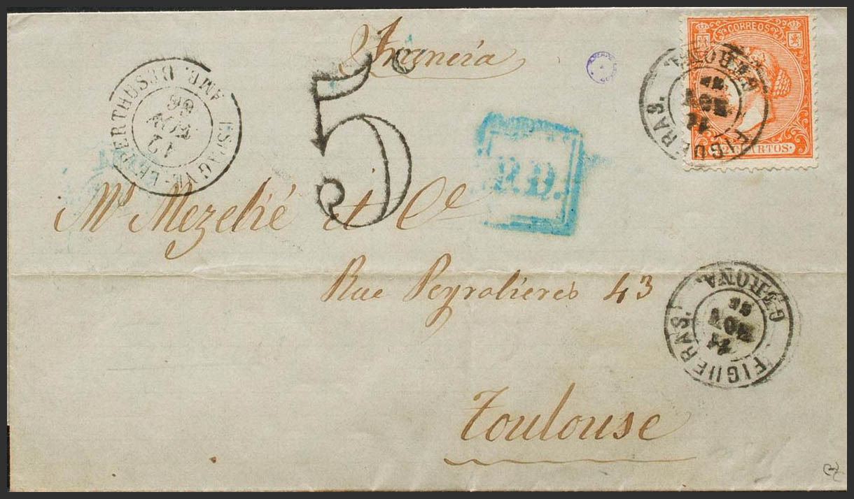 82. 1866. 12 orange cuartos . FIGUERAS to PERPIÑAN (FRANCE). Postmark FIGUERAS / GERONA. MAGNIFICENT. Ex-Blight.