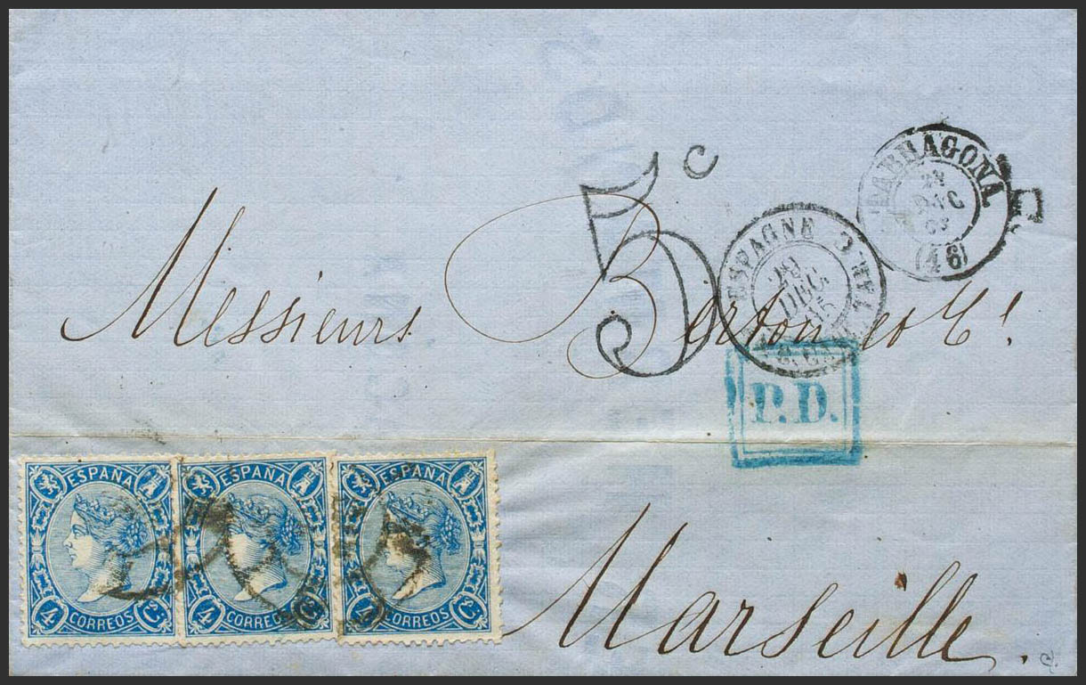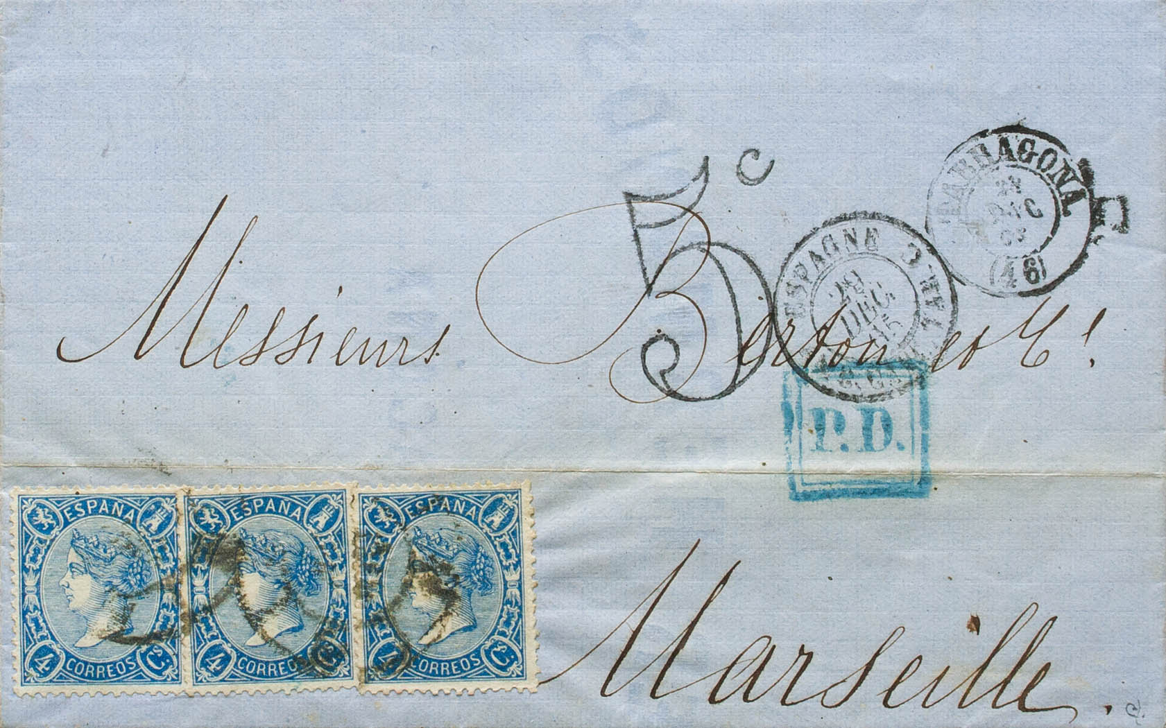 75(3). 1865. 4 blue cuartos , three stamps. TARRAGONA to MARSEILLE (FRANCE). Postmark R.CARRETA Nº46. MAGNIFICENT. Ex-Blight.