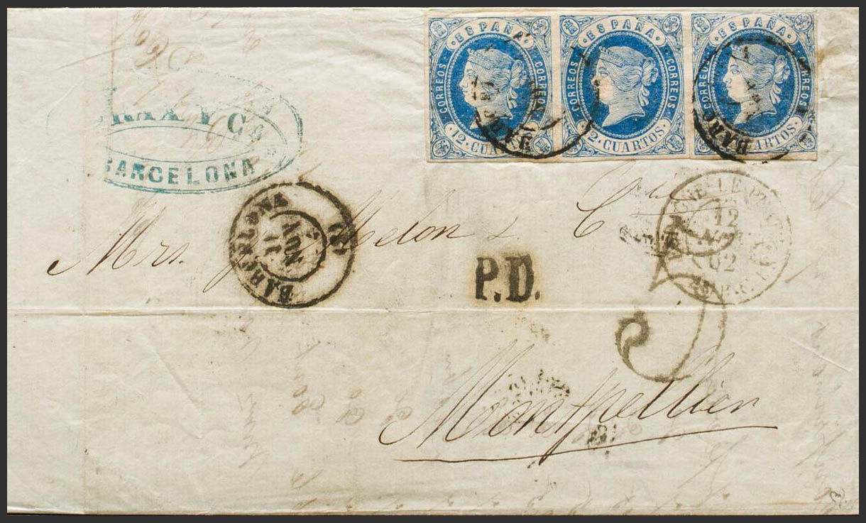 59(3). 1862. 12 cuartos blue, strip of three. BARCELONA to MONTPELLIER (FRANCE). Postmark BARCELONA / (2), postage triple postage. MAGNIFICENT AND RARE. Ex-Blight.