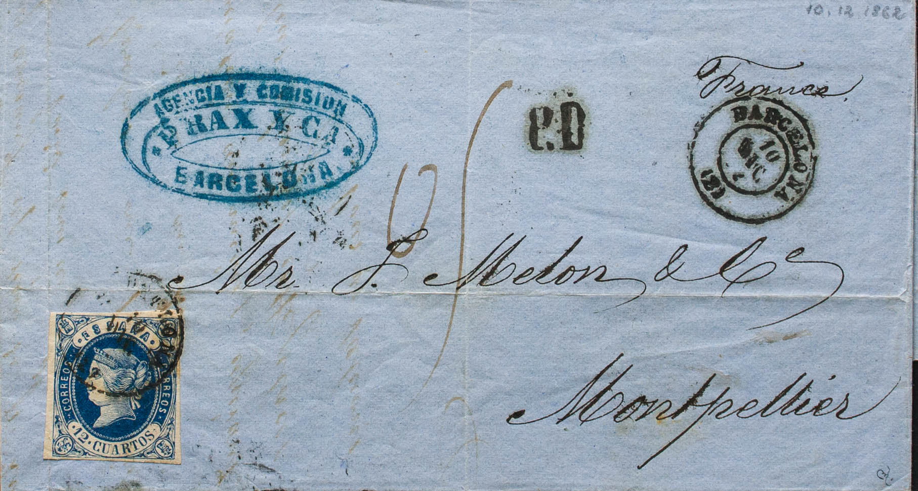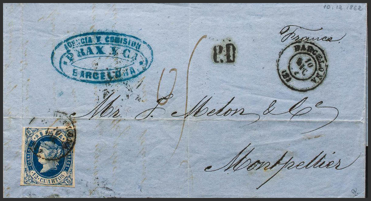 59. 1862. 12 cuartos blue. BARCELONA to MONTPELLIER (FRANCE). Postmark BARCELONA / (2). MAGNIFICENT. Ex-Blight.