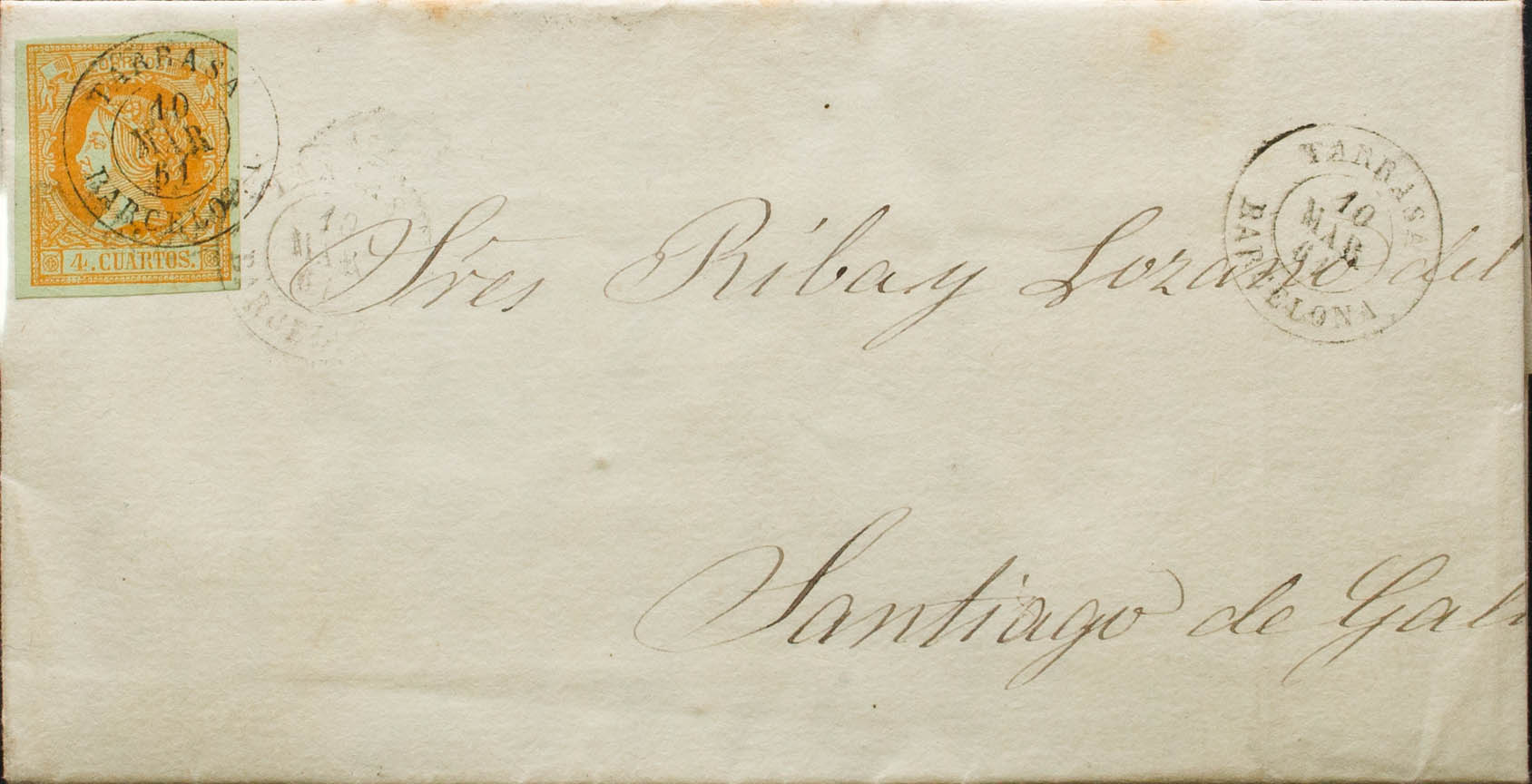 52. 1861. 4 orange cuartos . TARRASA to SANTIAGO DE COMPOSTELA. Postmark TARRASA / BARCELONA. MAGNIFICENT.
