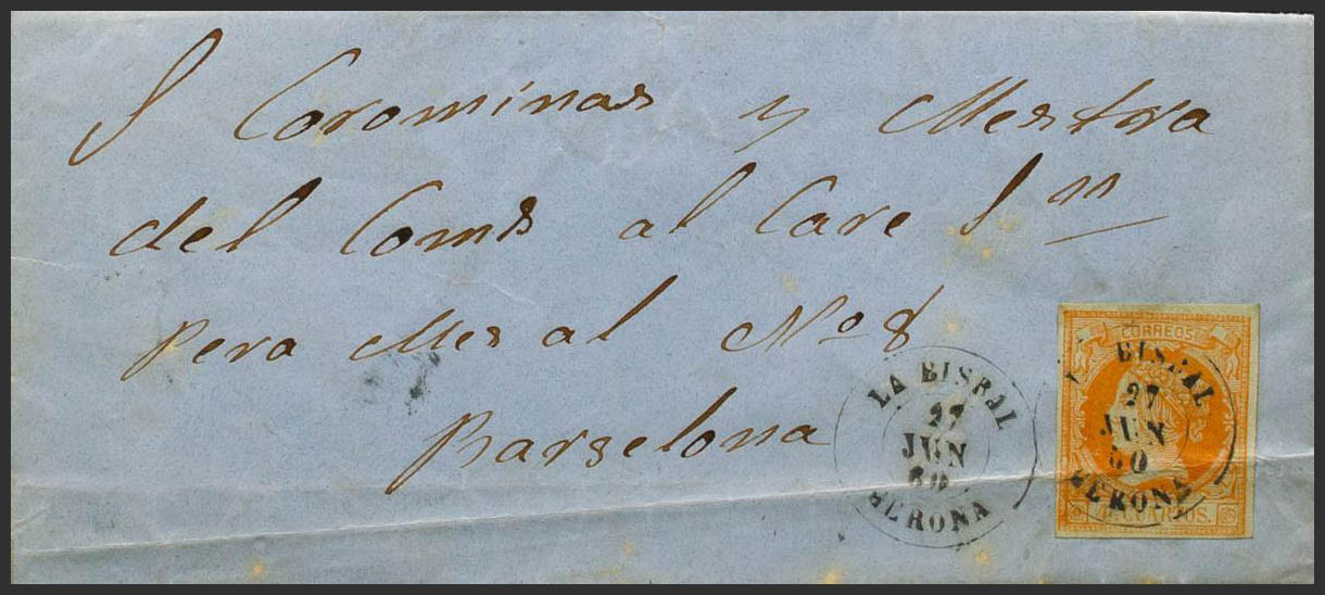 52. 1860. 4 cuartos orange (archival fold). LA BISBAL to BARCELONA. Postmark LA BISBAL / GERONA. MAGNIFICENT.