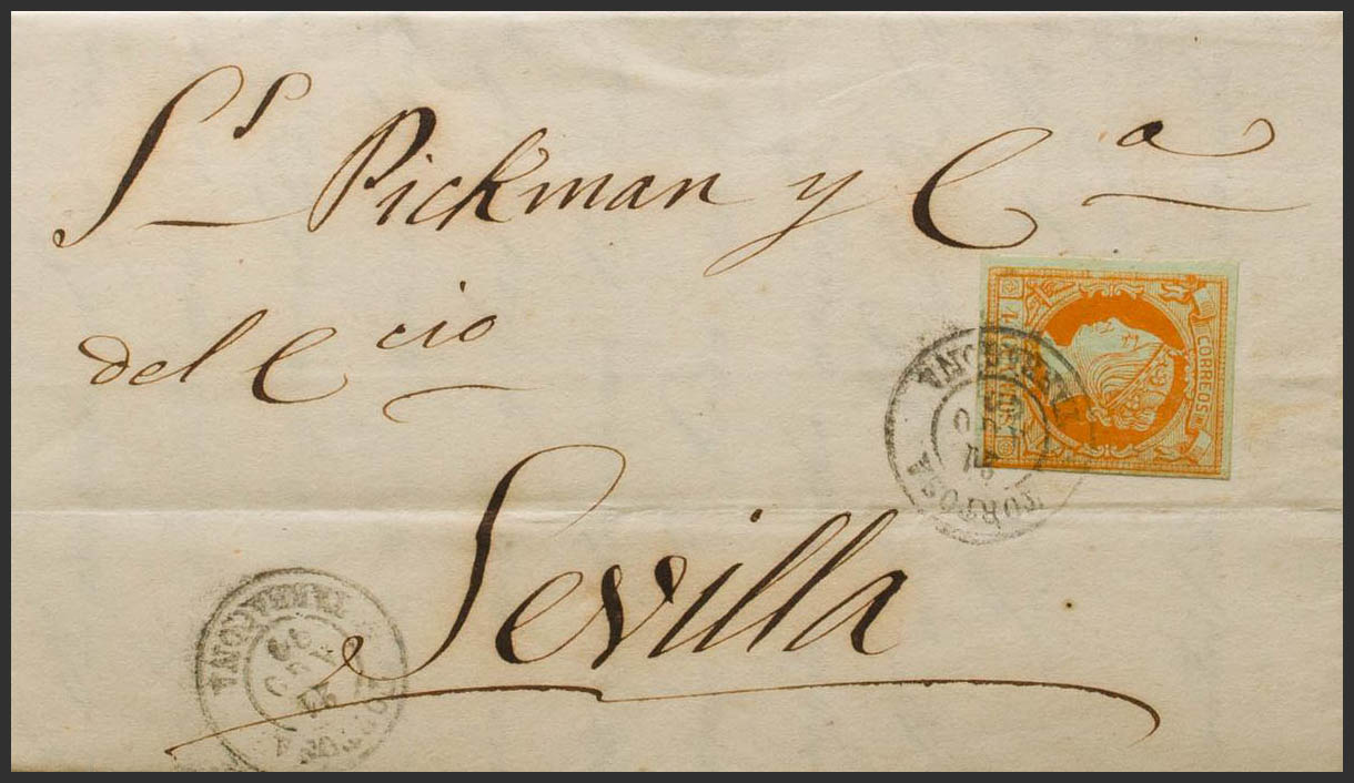 52. 1860. 4 orange cuartos . TORTOSA to SEVILLE. Postmark TORTOSA / SEVILLE. MAGNIFICENT.