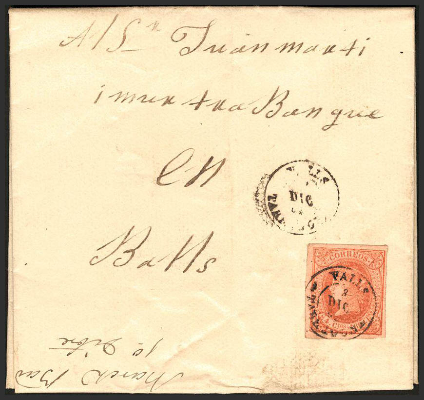 64. 1864. 4 red cuartos . JUNEDA to VALLS. Postmark VALLS / TARRAGONA, upon arrival.