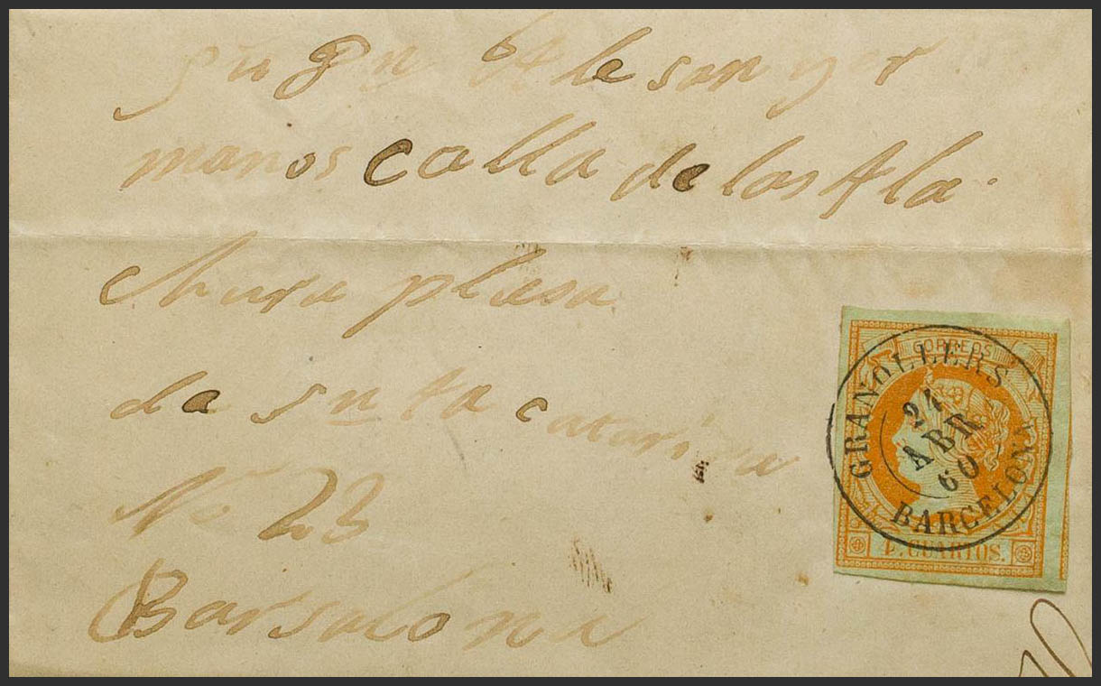 52. 1860. 4 orange cuartos . GRANOLLERS to BARCELONA. Postmark GRANOLLERS / BARCELONA. MAGNIFICENT AND RARE.