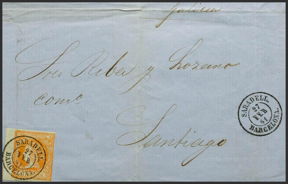 52. 1861. 4 orange cuartos , leaf edge. SABADELL to SANTIAGO. Postmark SABADELL / BARCELONA. MAGNIFICENT.
