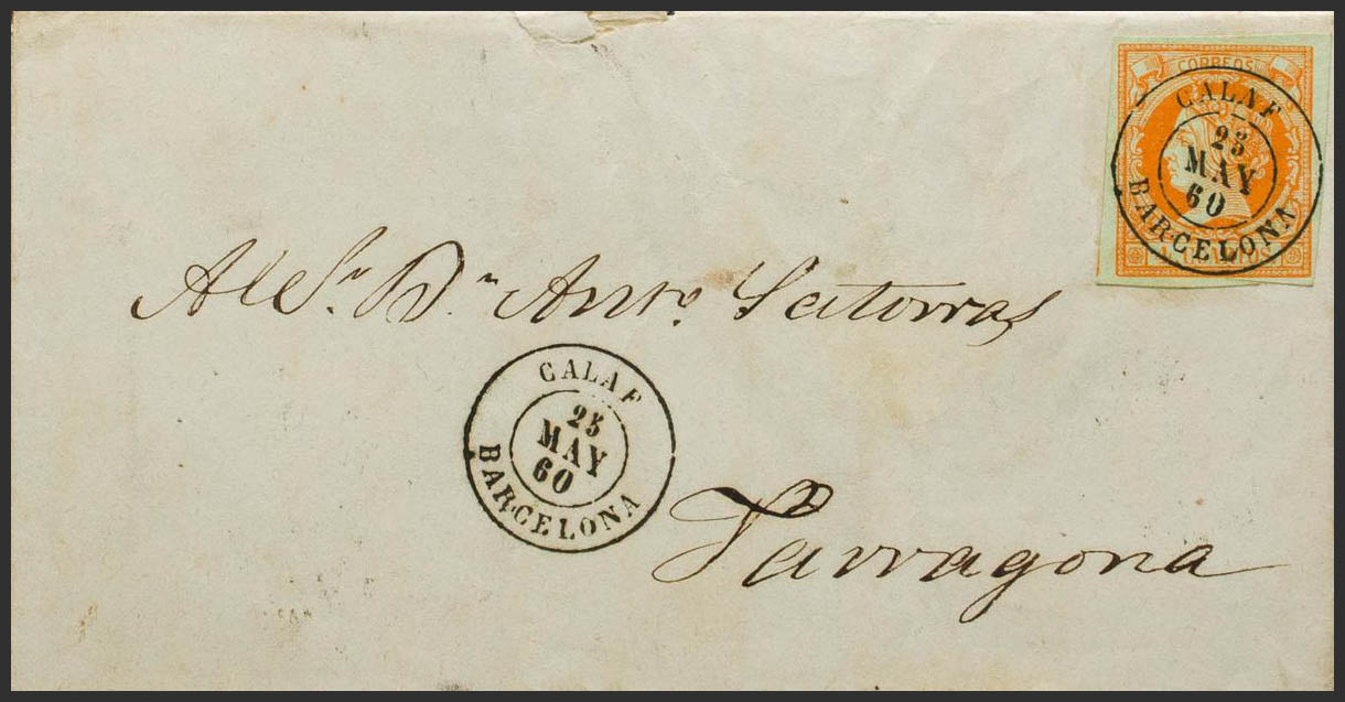 52. 1860. 4 orange cuartos . CALAF to TARRAGONA. Postmark CALAF / BARCELONA. MAGNIFICENT AND RARE.