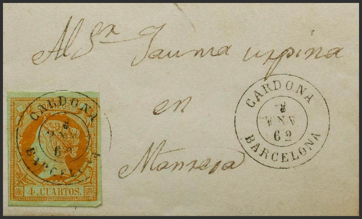52. 1862. 4 orange cuartos . BERGA to MANRESA. Postmark CARDONA / BARCELONA. MAGNIFICENT AND RARE.