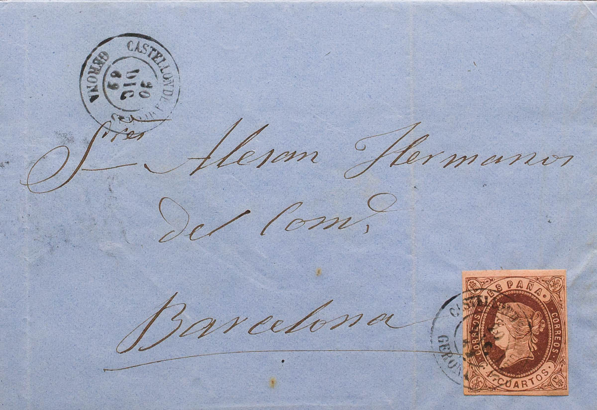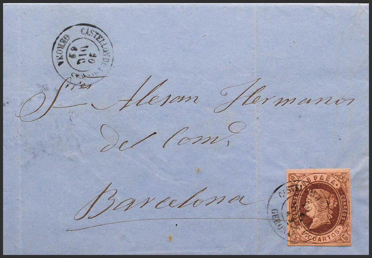 58. 1862. 4- cuartos chestnut. ROSES (GERONA) to BARCELONA. Postmark CASTELLON DE AMPURIAS / GERONA. MAGNIFICENT.