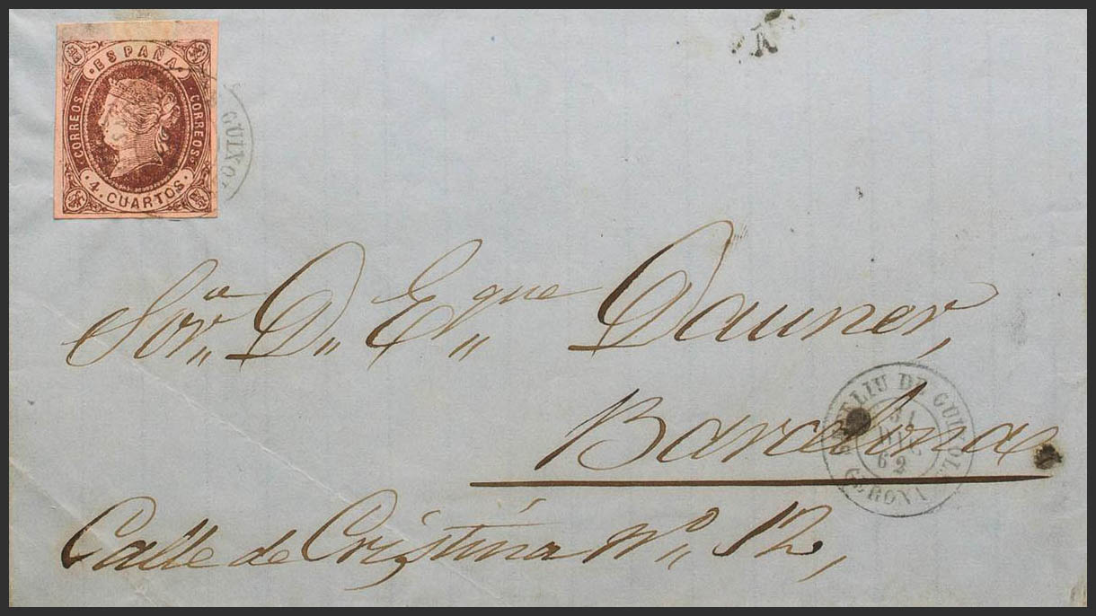 58. 1862. 4- cuartos chestnut. SAN FELIU DE GUIXOLS (GERONA) to BARCELONA. Postmark SN.FELIU DE GUIXOLS / GERONA. MAGNIFICENT.