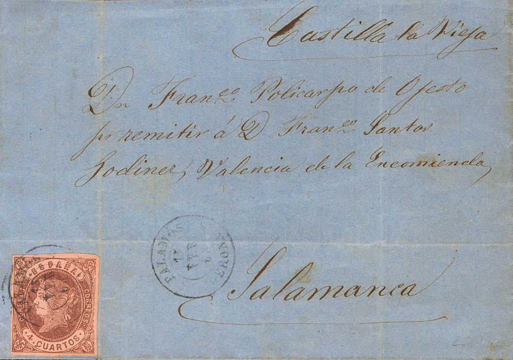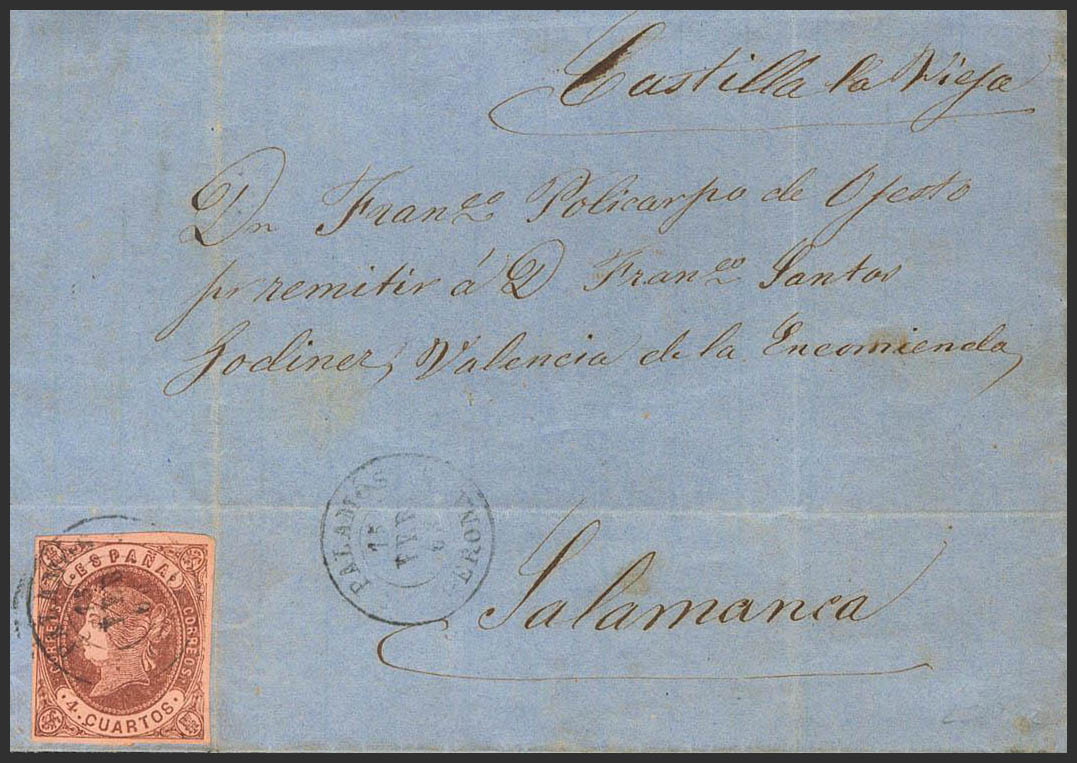 58. 1863. 4- cuartos chestnut. PALAMOS to SALAMANCA. Postmark PALAMOS / GERONA. MAGNIFICENT.