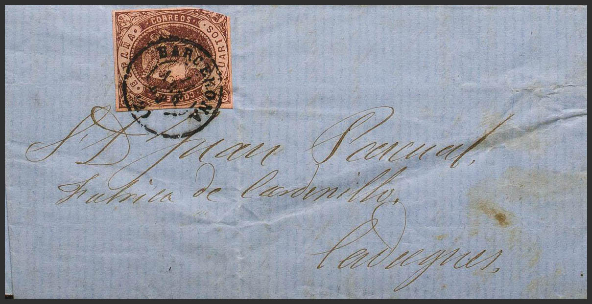 58. 1863. 4- cuartos chestnut (short corner). BARCELONA to CADAQUES. Postmark BARCELONA / (2). BEAUTIFUL AND RARE.