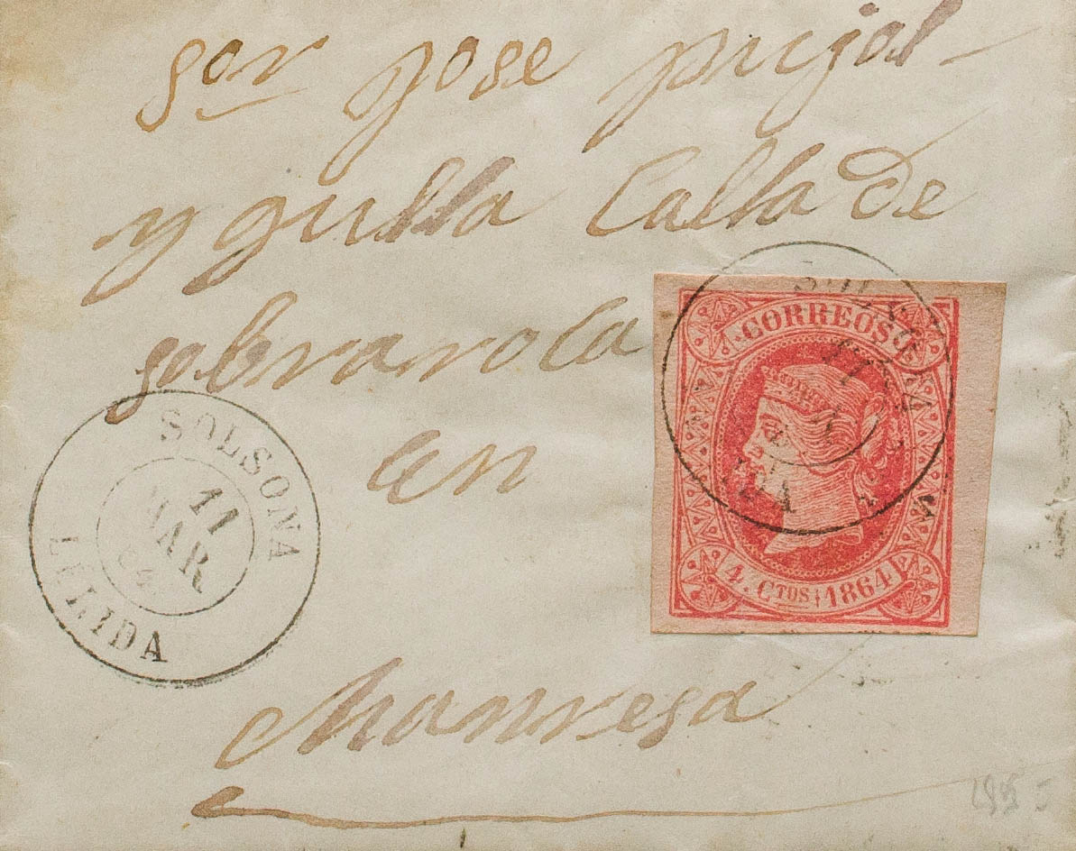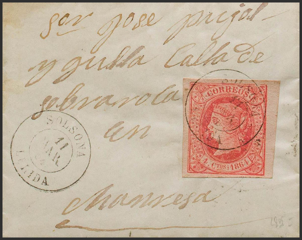 64. 1864. 4 red cuartos . SOLSONA to MANRESA. Postmark SOLSONA / LERIDA. MAGNIFICENT AND RARE.