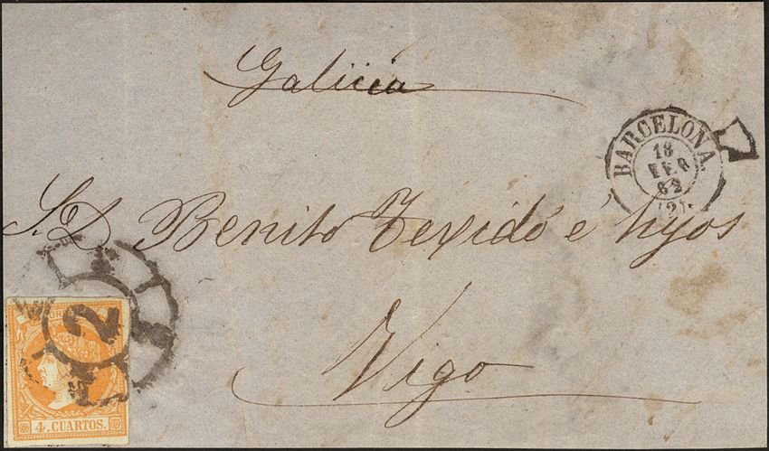 52. 1862. 4 cuartos yellow. Front from BARCELONA to VIGO. Postmark R. CARRETA Nº 2.