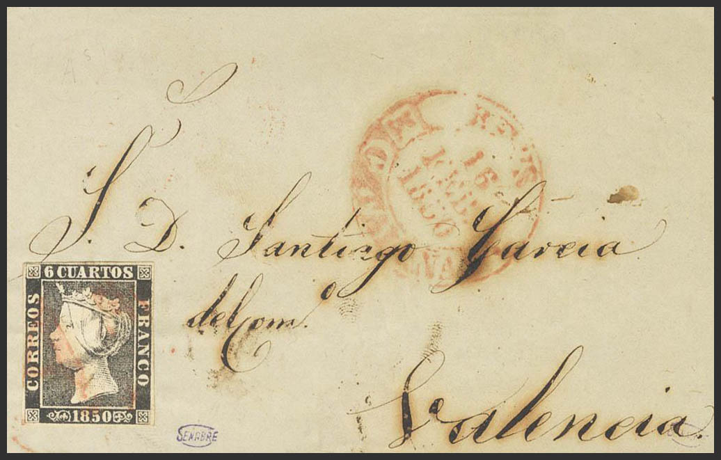 1A. 1850. 6 cuartos black. Front from REUS to VALENCIA. Postmark "AS", from Reus. MAGNIFICENT AND VERY RARE ON LETTER, NO MORE THAN FOUR KNOWN. Cert. EMF. Ex-Senabre.