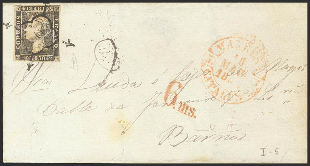 1. 1850. 6 cuartos black. MANRESA to BARCELONA. MAGNIFICENT.