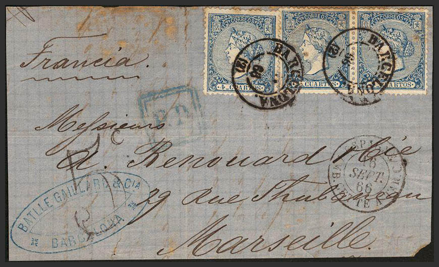 81(3). 1866. 4 blue cuartos , a pair and a seal. Front from BARCELONA to MARSEILLE(FRANCE). Postmark BARCELONA / (2). MAGNIFICENT.