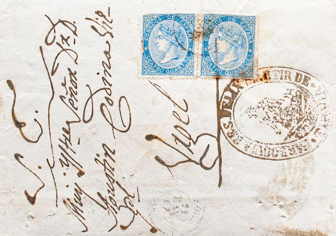 88(2). 1867. 4 cuartos blue, two stamps (slight defects). TIRVIA (LERIDA) to URGEL. On the front it marks PARISH OF S.FELIX MARTIR DE / TIRVIA. PRETTY.
