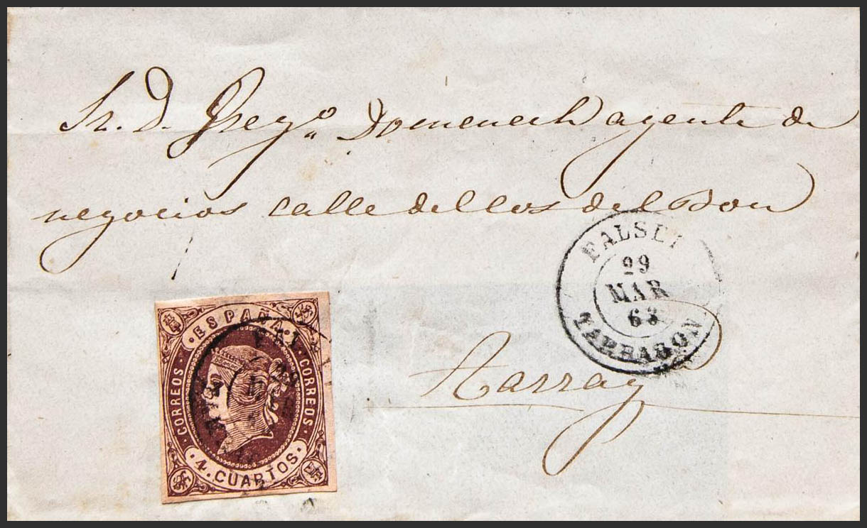 58. 1863. 4 cuartos chestnut. FALSET to TARRAGONA. Postmark FALSET / TARRAGONA. MAGNIFICENT.
