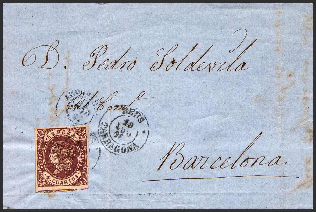 58. 1863. 4 cuartos chestnut. REUS to BARCELONA. Postmark REUS / TARRAGONA. MAGNIFICENT.