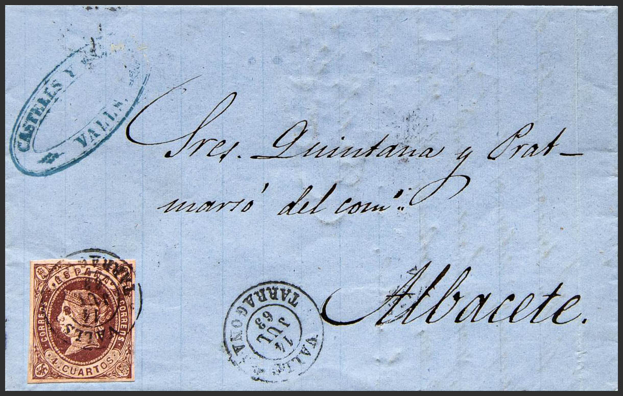 58. 1863. 4 cuartos chestnut. VALLS to ALBACETE. VALLS / TARRAGONA postmark. MAGNIFICENT.