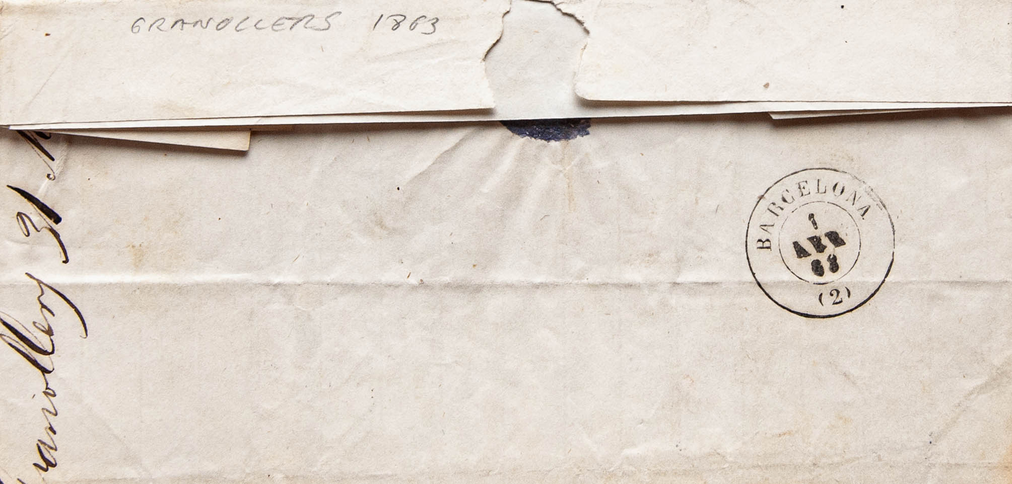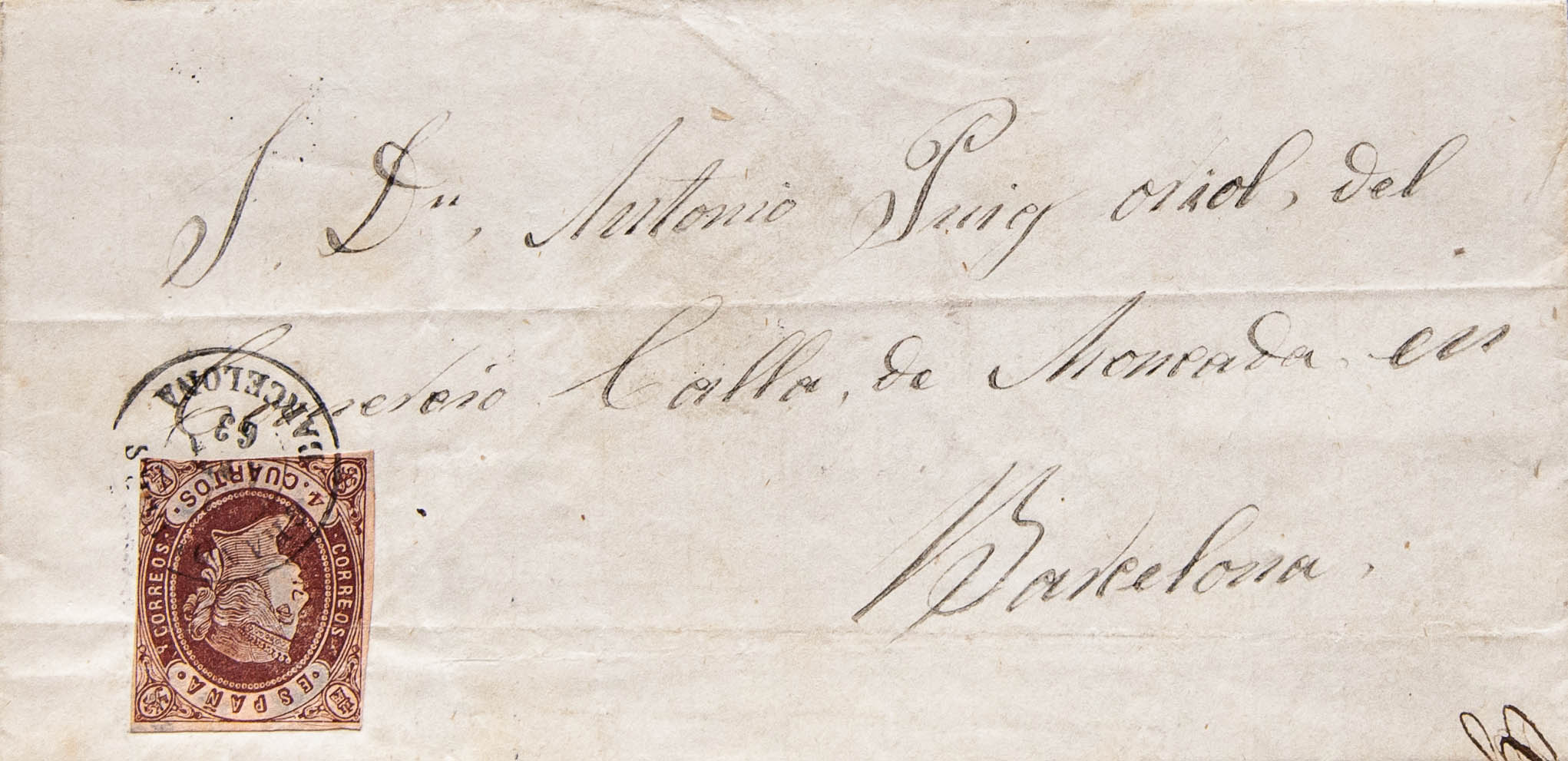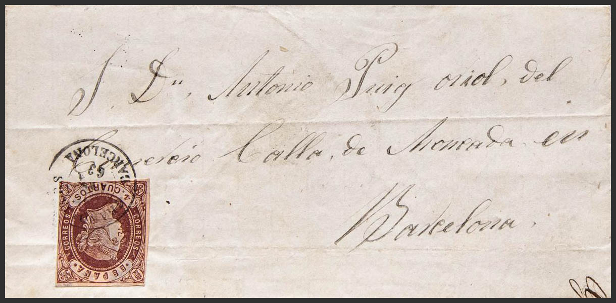 58. 1863. 4 cuartos chestnut. GRANOLLERS to BARCELONA. Postmark GRANOLLERS / BARCELONA. MAGNIFICENT.
