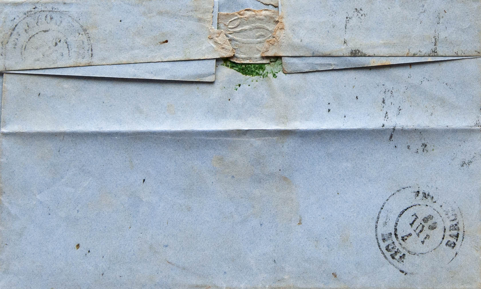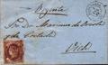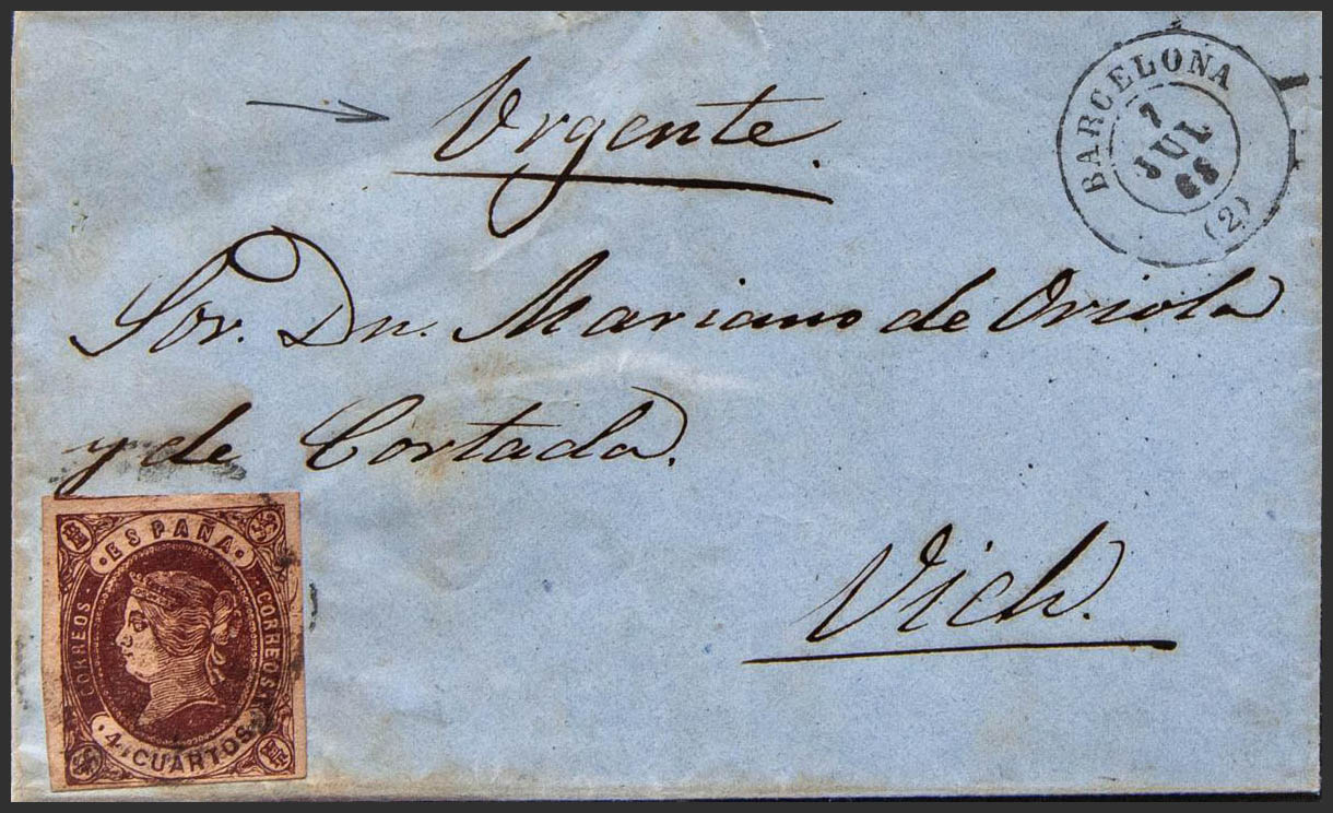 58. 1863. 4 cuartos chestnut. BARCELONA to VICH. Postmark R.CARRETA Nº2, from Barcelona and on the front handwritten annotation "Urgent". MAGNIFICENT AND RARE.