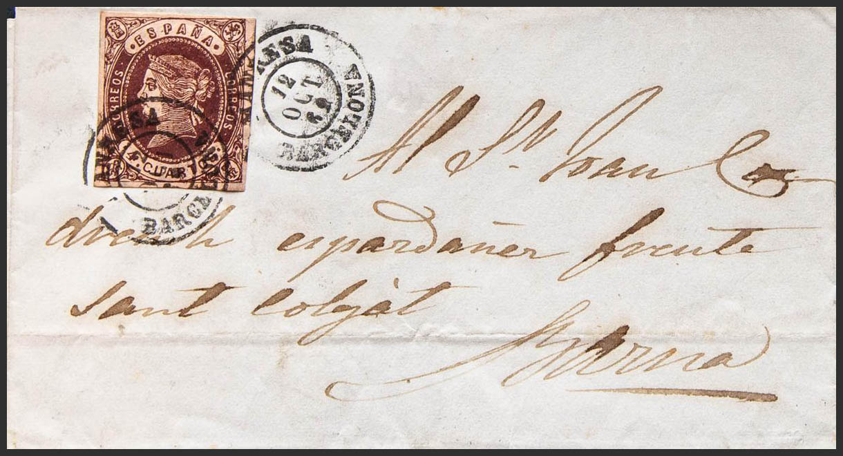 58. 1862. 4 cuartos chestnut. MANRESA to BARCELONA. MANRESA / BARCELONA postmark. MAGNIFICENT.