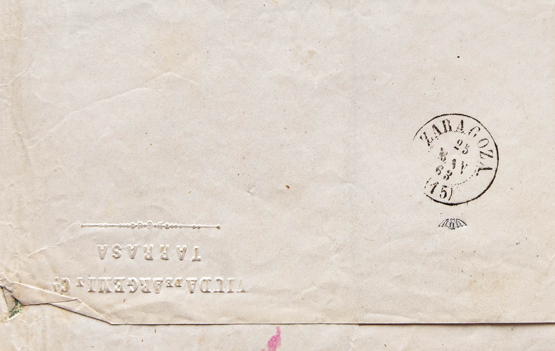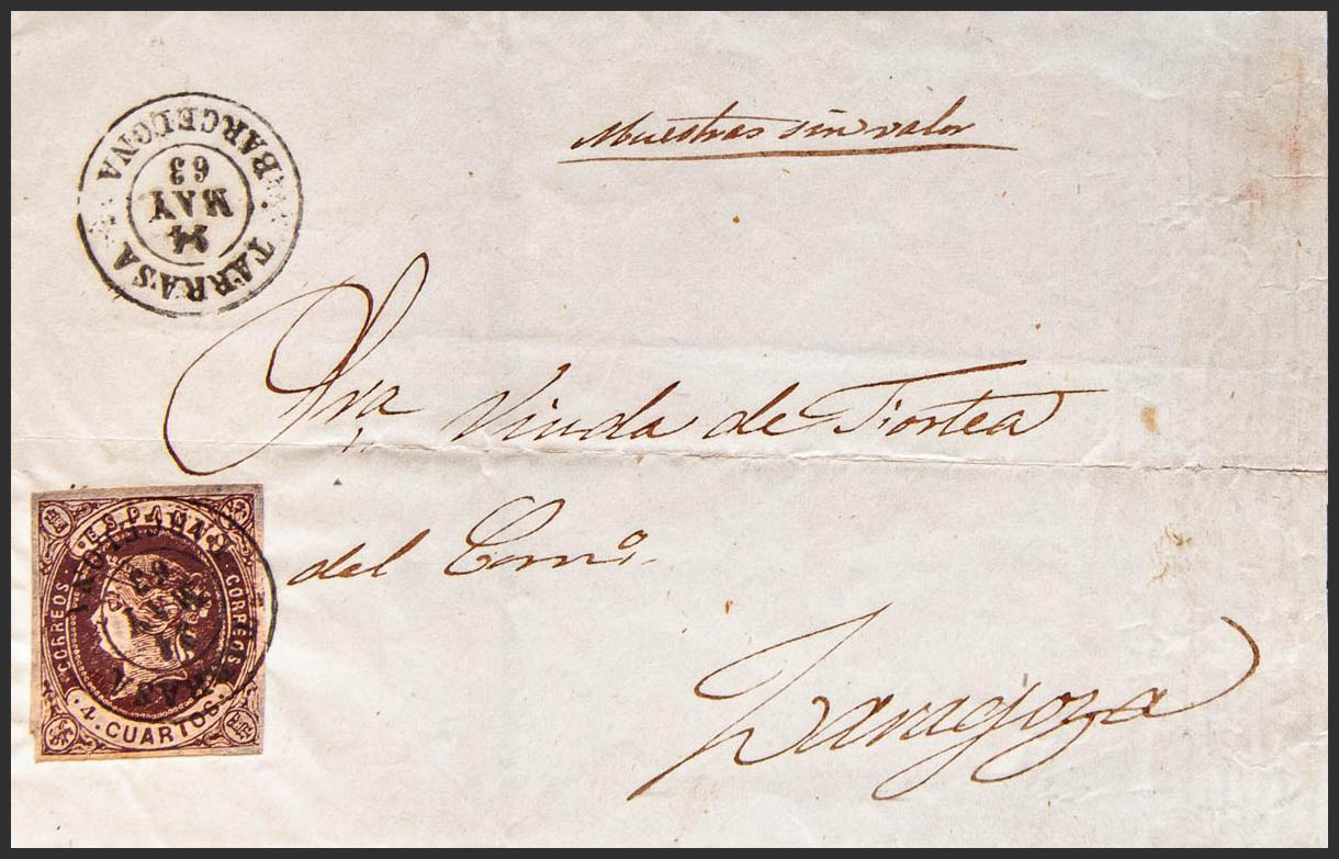 58. 1863. 4 cuartos chestnut. TARRASA to ZARAGOZA. Postmark TARRASA / BARCELONA and on the front handwritten annotation "Valueless samples". MAGNIFICENT.