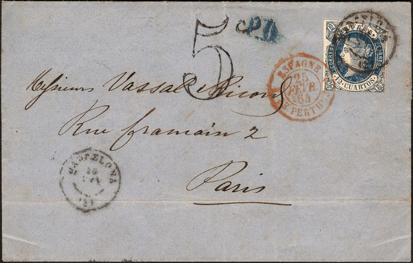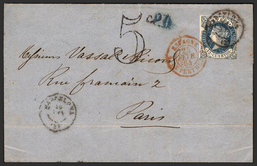 59. 1864. 12 cuartos blue. BARCELONA to PARIS (FRANCE). Postmark BARCELONA / (2). MAGNIFICENT.