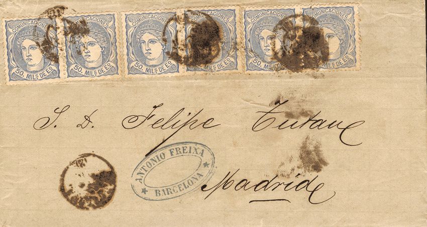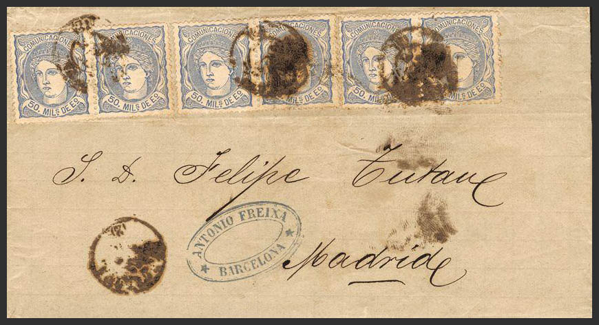 107(6). 1870. 50 thousand. Overseas, six stamps. BARCELONA to MADRID. Postmark BARCELONA / (2). RARE SIX PORTES LETTER.