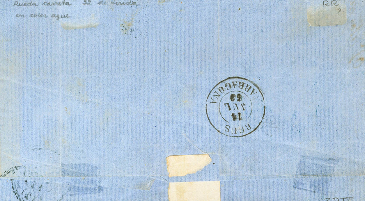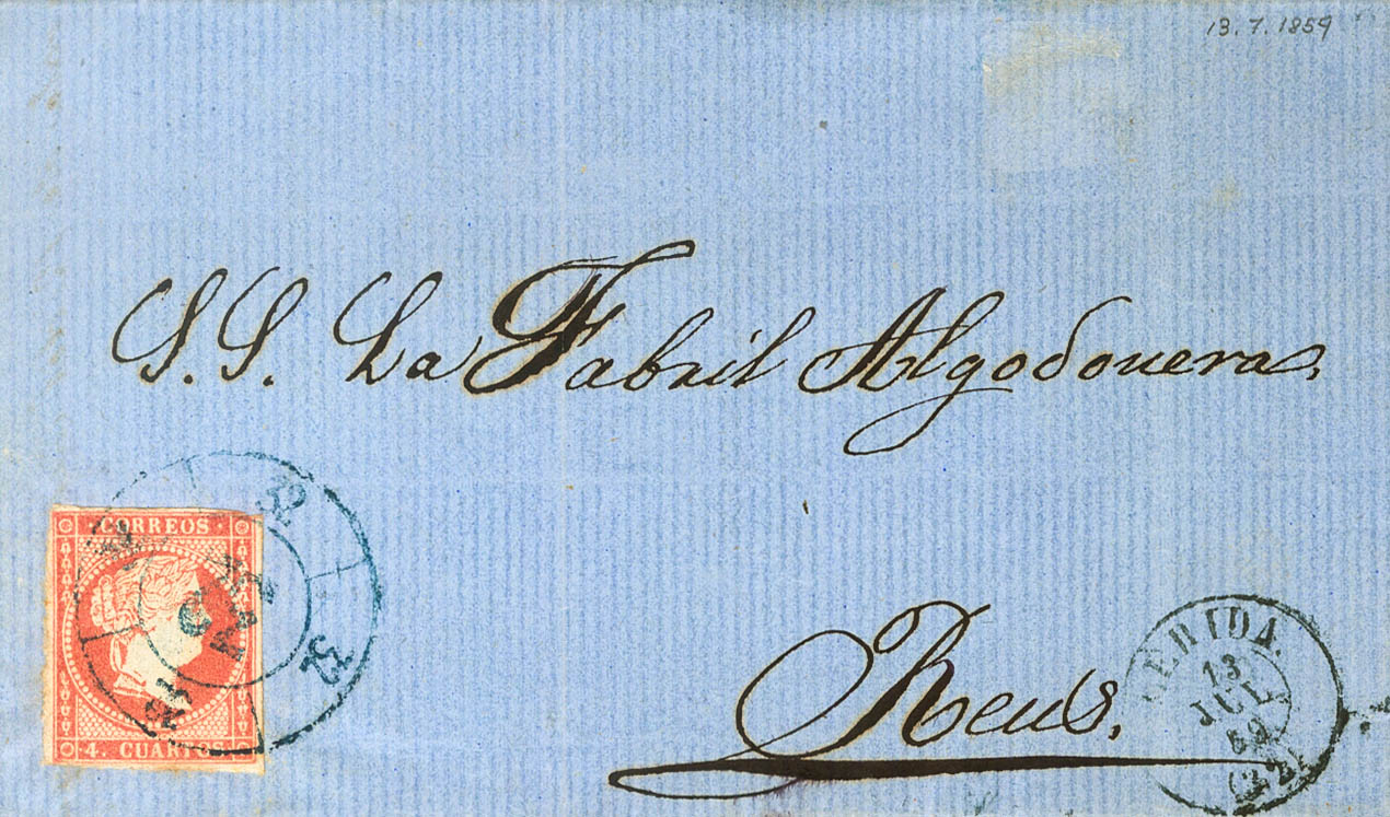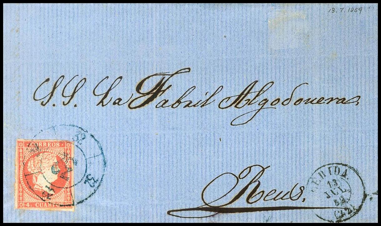 |ABOUT| 48. 1858. 4 red quarters. LERIDA to TARRAGONA. Postmark R.CARRETA Nº32, from Lérida, in blue. MAGNIFICENT AND SPECTACULAR.