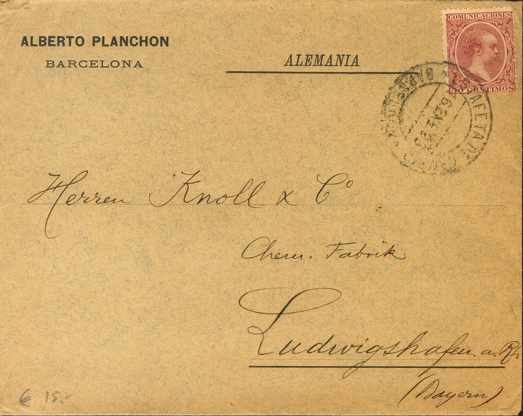 |ENVELOPE| 224. 1898. 50 cts carmine. BAGoodELONA to LUDWIGSHAFEN (GERMANY). Postmark ESTAFETA DE CAMBIO / BAGoodELONA, arrival on the back (double postage rate). MAGNIFICENT.