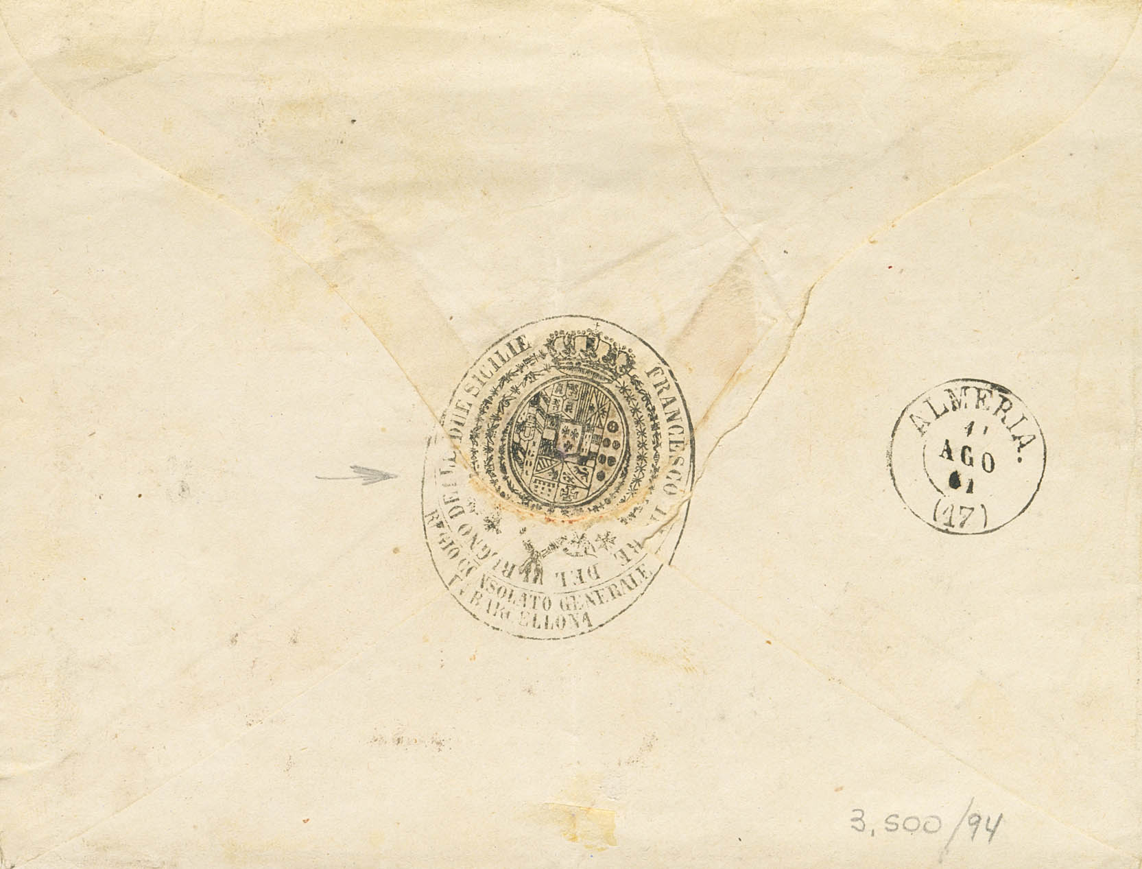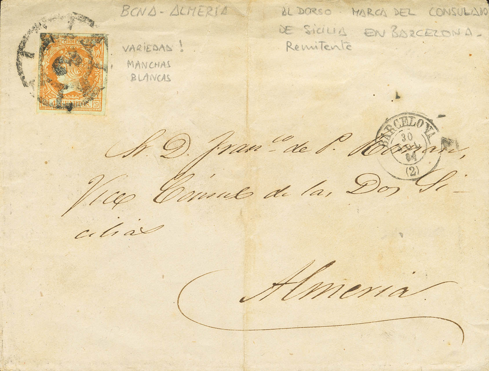 |ABOUT| 52. 1861. 4 orange quarters. BAGoodELONA to ALMERIA. Postmark R.CARRETA Nº2 and on the back the mark of the Consulate of the Kingdom of the Two Sicilies. MAGNIFICENT.