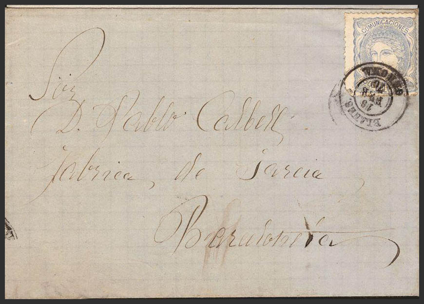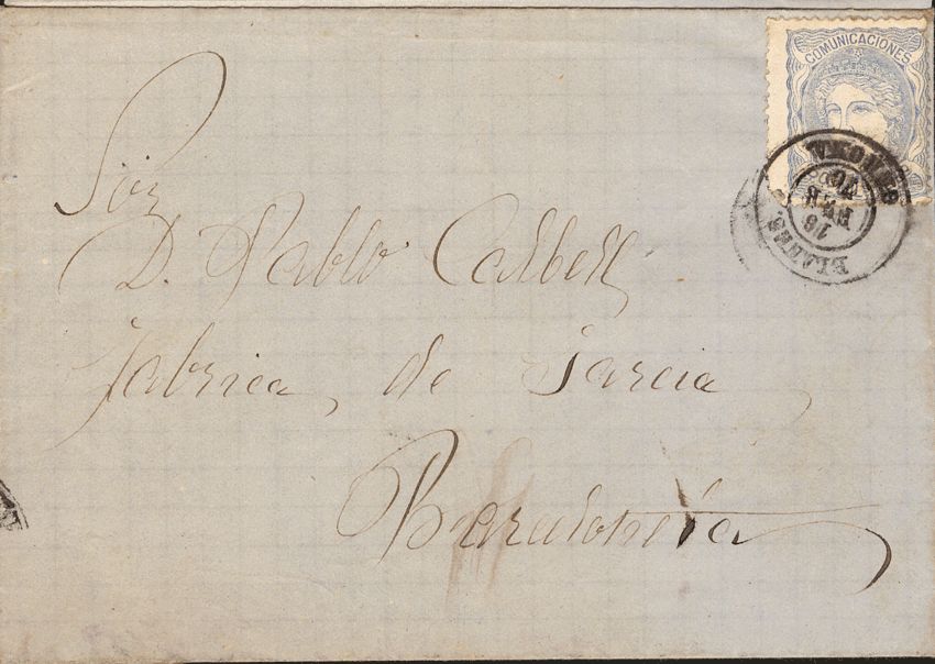 107. 1870. 50 mils blue. BLANES to BARCELONA. Postmark BLANES / GERONA. MAGNIFICENT.