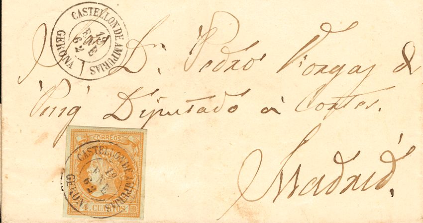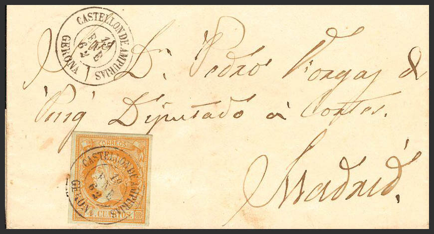 52. 1862. 4 cuartos yellow. CASTELLON DE AMPURIAS to MADRID. Postmark CASTELLON DE AMPURIAS / GERONA. MAGNIFICENT.
